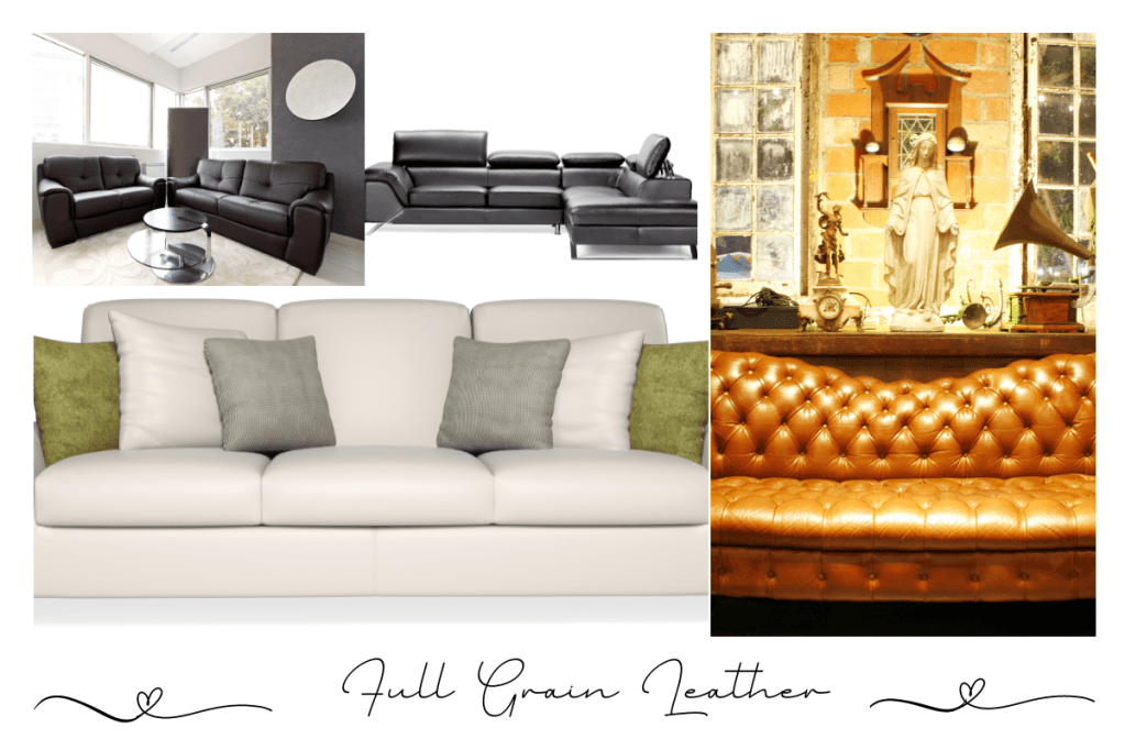 Full grain leather is the most durable type of leather. Its integrity is not compromised by sanding or other processes. Full grain leather is more resistant to stains and scratches than top grain leather because it doesn’t have a protective layer that wears off.