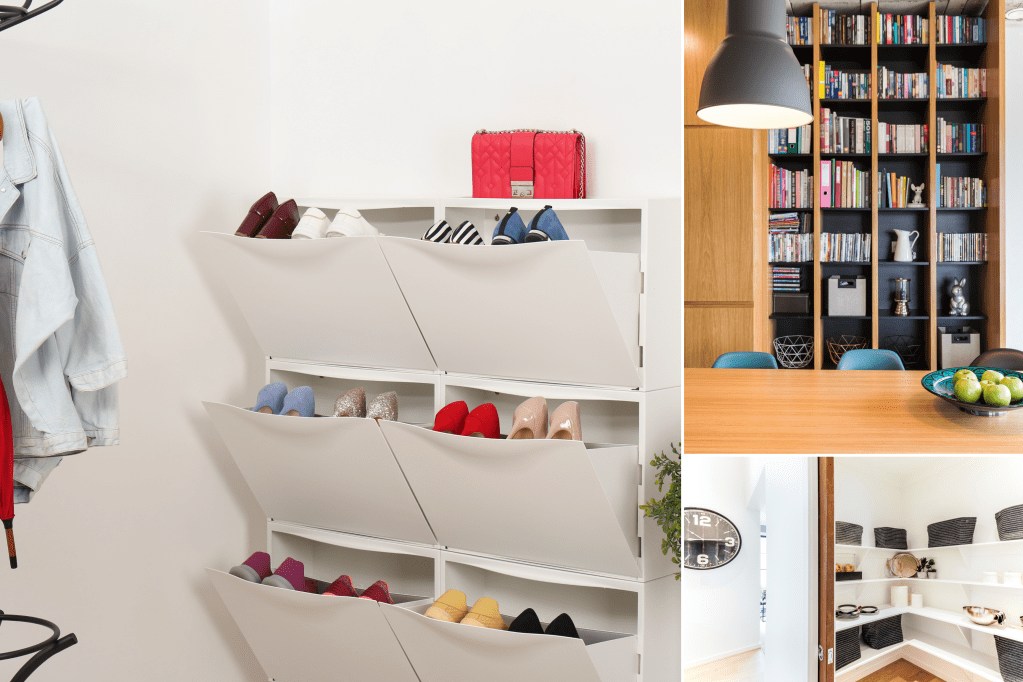 Behind-the-Door Storage: Hang a shoe organizer or over-the-door rack on the back of your living room storage ideas door to store shoes, scarves, and other small items.