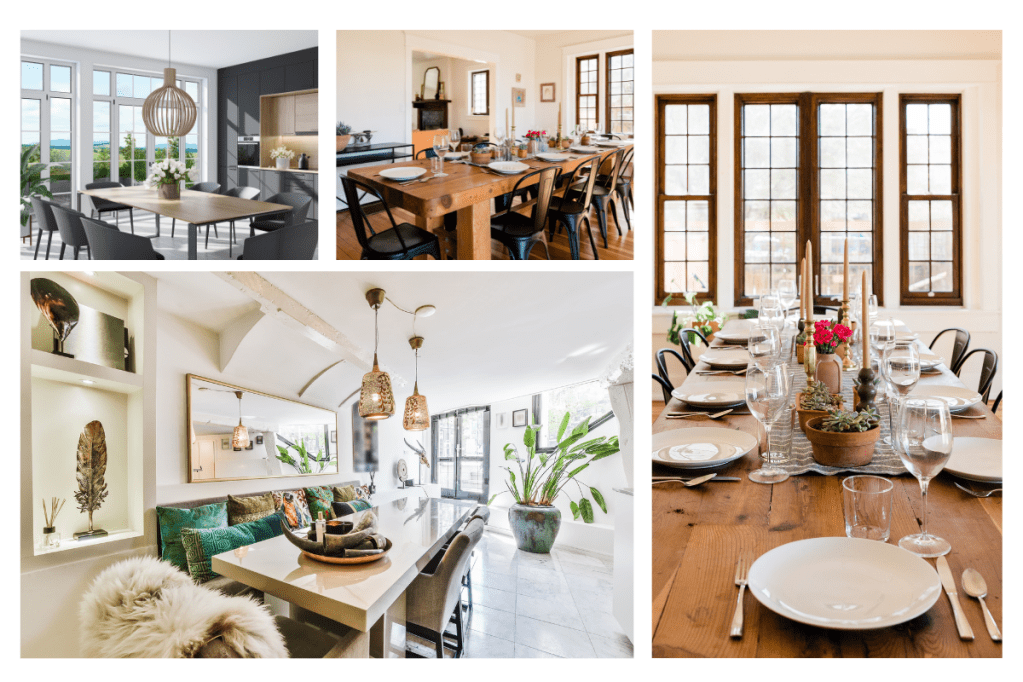 Your dining room’s color scheme is another consideration. Decor and artwork that match your color scheme can help create a unified space. Contrasting colors can produce a dramatic, eye-catching effect.